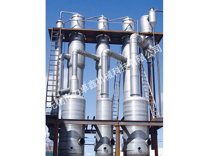 工作原理:四效降膜蒸發(fā)器需濃縮的料液由泵送入加熱管頂部,沿著加熱管內(nèi)壁形成液膜向下流動。在這個過程中,由于管外的加熱,管內(nèi)液膜開始沸騰并部分蒸發(fā)