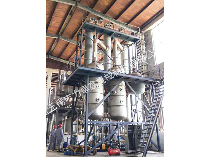 工作原理:四效降膜蒸發(fā)器需濃縮的料液由泵送入加熱管頂部,沿著加熱管內(nèi)壁形成液膜向下流動。在這個過程中,由于管外的加熱,管內(nèi)液膜開始沸騰并部分蒸發(fā)
